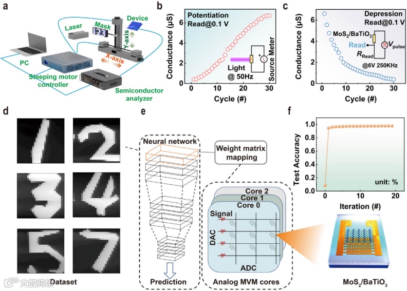 Furthermore, the device was used to construct a multi-layer perceptron network integrating visual perception and image recognition5. In the MNIST handwritten digit recognition task, the network achieved an impressive accuracy of 97.6%. This study demonstrates the potential of MoS2/BaTiO3-based neuromorphic devices in advancing compact, low-power artificial intelligence systems.