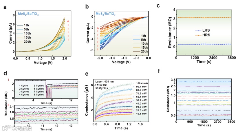 本研究提出了一种基于MoS2和BaTiO3的异质结光电器件。利用BaTiO3中的铁电极化弛豫滞后于电和光激励特性3,4,实现了电场与光脉冲双重调控下的电导状态切换。实验中,该器件展现出清晰的电阻切换行为,以及通过光脉冲实现的多电导状态(图2)。