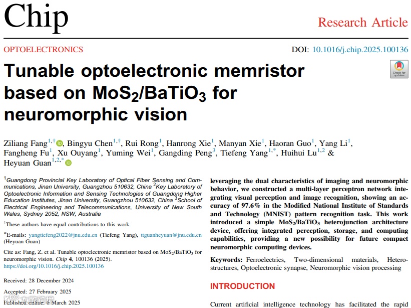 近日,暨南大学大学关贺元,卢惠辉团队以「Tunable optoelectronic memristor based on MoS2/BaTiO3 for neuromorphic vision」¹为题在Chip上发表研究论文,文章展示了一种基于MoS2/BaTiO3异质结的光电器件,成功实现了紧凑结构下的多级电导调控和类生物突触行为模拟,为低功耗人工智能芯片的发展提供了新思路。第一作者为方子良、陈炳羽,通讯作者为杨铁锋副教授和关贺元教授。
