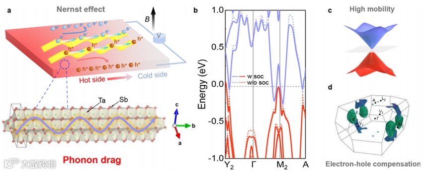 在能源转化与热管理技术的前沿研究中,热电材料一直被视为实现绿色能源与高效制冷的重要途径。传统热电效应主要依赖于塞贝克效应(Seebeck effect),但由于电子与声子的输运强烈耦合,往往难以同时实现低热导率与高电导率,从而限制了性能提升。近年来,随着拓扑半金属的兴起,横向能斯特热电效应(Nernst effect)受到越来越多关注。这种效应利用电子和空穴在磁场下的协同贡献,可以避免传统热电器件中p型与n型材料匹配的难题,同时在理论上突破了塞贝克热电功率因子的上限。因此,能斯特效应不仅为低温固态制冷提供了新的候选方案,也为材料物理提出了新的研究方向。然而,尽管许多拓扑半金属表现出接近完美的电子-空穴补偿和超高迁移率,其能斯特响应却差异巨大,从几十到数千微伏每开尔文不等,这表明仅靠能带结构与载流子补偿并不足以解释能斯特效应的增强机理。近年来有学者注意到,声子拖曳效应(phonon drag)可能在其中扮演关键角色,它通过与载流子的相互作用放大电子与空穴的塞贝克系数差异,从而显著增强能斯特响应。但这一机理在拓扑半金属中的定量证据仍然稀缺,因此寻找典型体系加以验证,成为该领域亟待解决的问题。