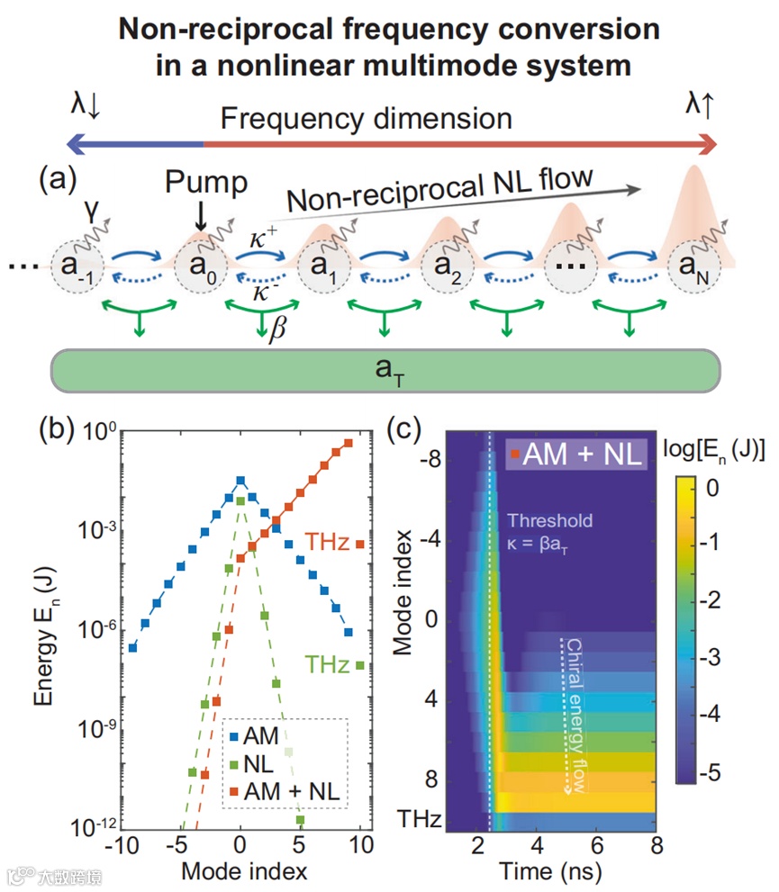 非线性光学系统长期以来作为先进光子学的基石,支撑了从频率转换、高速通信到量子信息处理等广泛应用。近年来,研究重点逐渐转向多模非线性系统,它们能够通过复杂的非线性过程展现更为丰富的相互作用。然而,传统非线性光学受制于材料固有特性,非线性效应通常较弱且遵循互易性。这不仅限制了频率转换效率,也使得非线性能量传输难以灵活调控。若能在多模系统中实现对非线性相互作用的有效控制,将有望突破常规效率极限,并在真实与合成频率维度中实现新的拓扑现象。