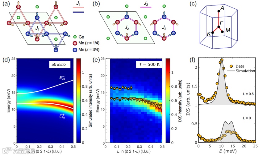 近日,德国奥格斯堡大学的A. S. Sukhanov和韩国基础科学研究所的O. I. Utesov研究团队合作,以Kagome反铁磁体Mn3Ge为研究对象,通过非弹性X射线散射实验与第一性原理计算相结合,揭示了其平面自旋涨落与横向光学声子之间的强耦合行为。实验发现在Γ点附近存在能量约为13 meV和17 meV的两个E2g声子模式,它们在低温下与磁子发生显著杂化,形成约2 meV的杂化能隙,并在动量空间中出现清晰的避免交叉现象。理论分析进一步表明,该耦合主要由层间海森堡交换作用驱动,并通过对称性分析和有效模型构建,明确了仅E2g对称性的声子模式能够与磁子发生线性耦合。Mn3Ge结构中磁性离子占主导,晶格振动与自旋激发均由锰原子承担,这一特性极大简化了杂化模式的识别与解析,使其成为研究磁子-声子相互作用的理想平台。该研究不仅为理解受抑制磁体中自旋-晶格耦合提供了微观机制,也为今后设计具有可调磁弹性特性的材料指明了方向。本研究成果发表于《Physical Review Letters》(刘梦洋)。