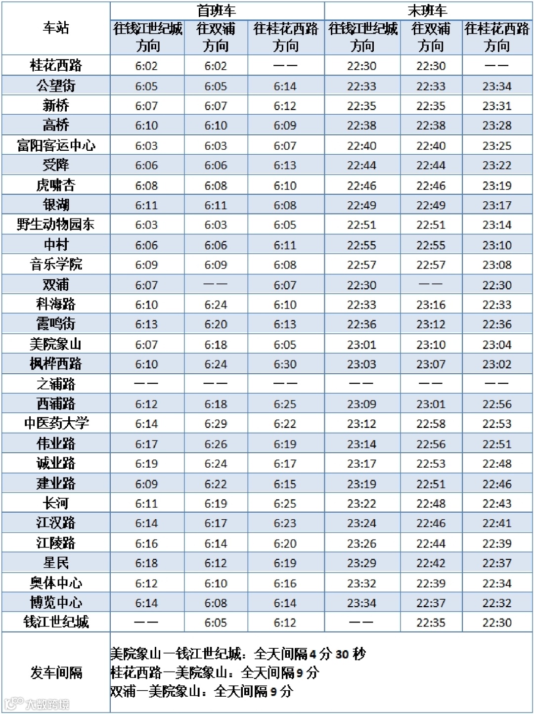 6号线从钱江世纪城站上车至双浦站,共18站,需35分钟左右,从钱江世纪城站至桂花西路站,共26站,则需一小时左右。其中杭富线起始于美院象山站,止于桂花西路站,共12站。