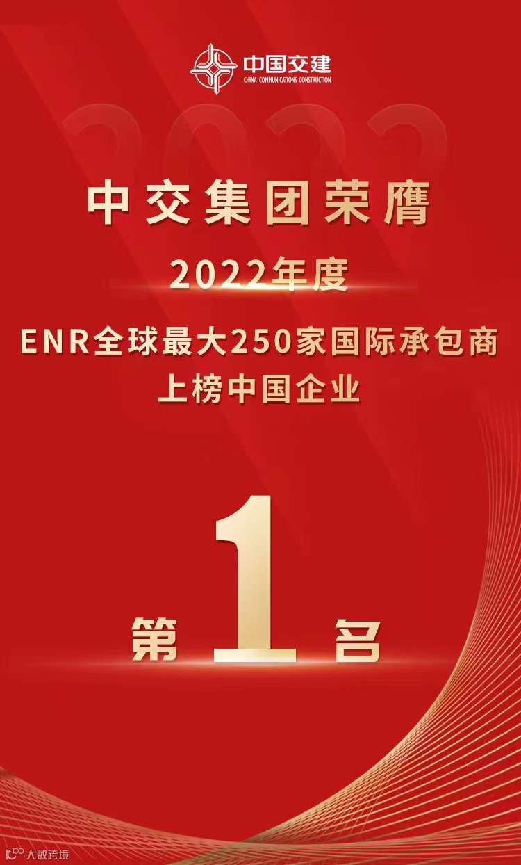 8月25日,2022年度美国《工程新闻纪录》(ENR)发布“全球最大250家国际承包商”榜单,中交集团列第3位,较上年排名提升1位,重返前三强,仅次于西班牙ACS/霍赫蒂芙集团和法国万喜公司。