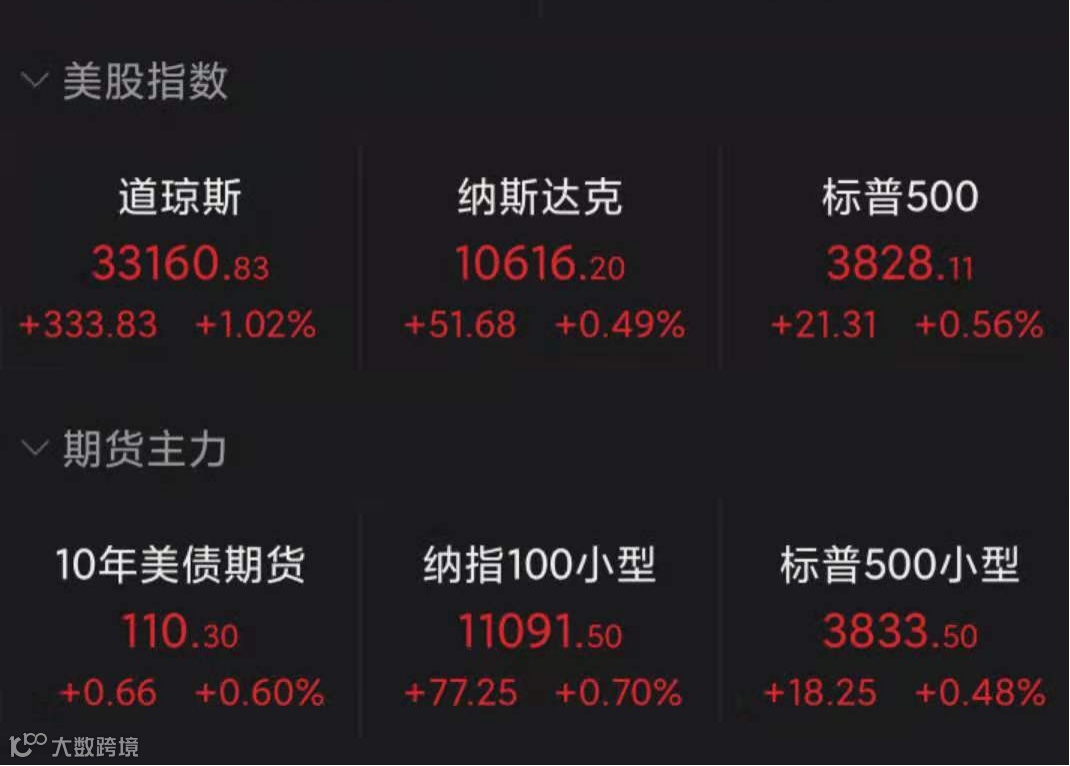 当地时间11月8日美国三大股指全线收涨,据Wind数据,截至收盘,道指涨1.02%报33160.83点,标普500指数涨0.56%报3828.11点,纳指涨0.49%报10616.2点。