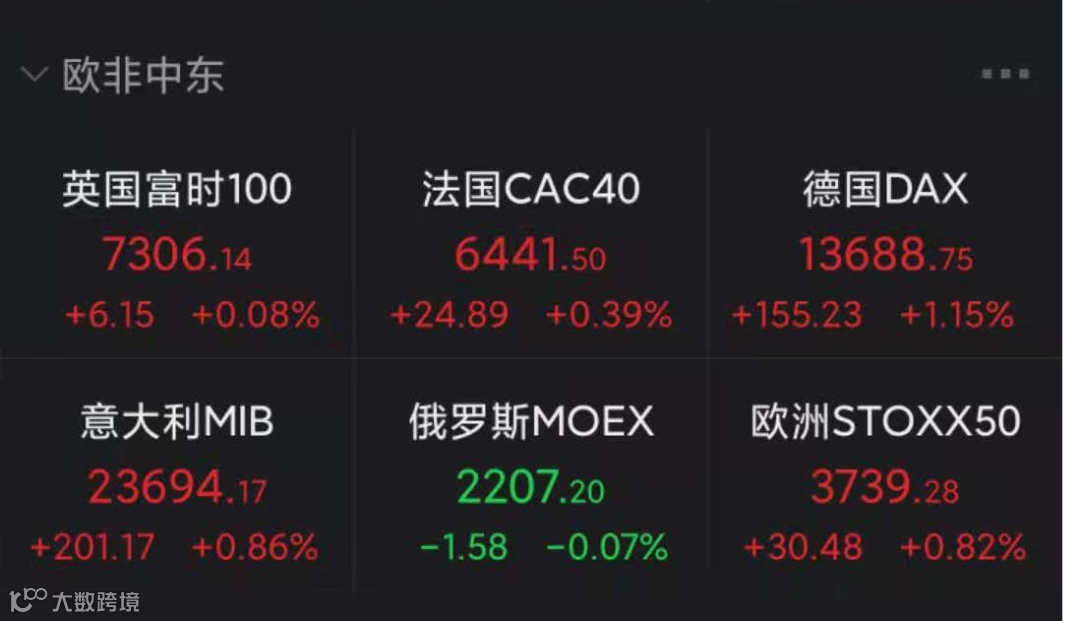 欧股收盘全线上涨,德国DAX指数涨1.15%报13688.75点,法国CAC40指数涨0.39%报6441.5点,英国富时100指数涨0.08%报7306.14点。
