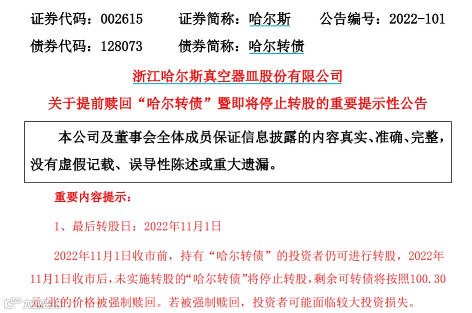 哈尔斯10月31日发布公告提示,11月1日收市前,持有哈尔转债的投资者仍可进行转股,11月1日收市后,未实施转股的哈尔转债将停止转股,剩余可转债将按照每张100.30元的价格被强制赎回。本次赎回完成后,哈尔转债将在深交所摘牌。