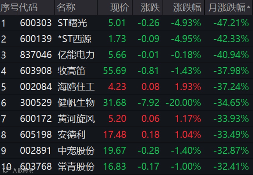跌幅榜方面,两只ST股以超过40%的跌幅,占据本月跌幅榜前两位。连续20%跌停的健帆生物也跻身跌幅榜前十。