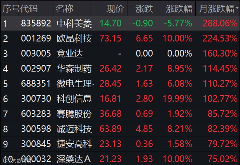 10月收官,A股本月十大牛股正式出炉,北交所股票中科美菱以288%的月涨幅拔得头筹。本月火热的信创板块牛股辈出,竞业达、科创信息、捷安高科均属于该板块。