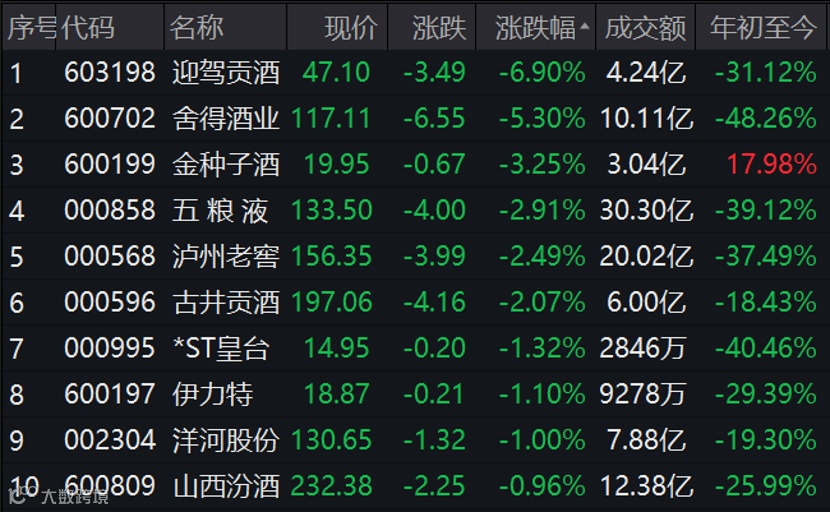 白酒板块今日延续跌势。截至收盘,迎驾贡酒、舍得酒业跌逾5%,五粮液、泸州老窖跌逾2%,贵州茅台跌0.74%。