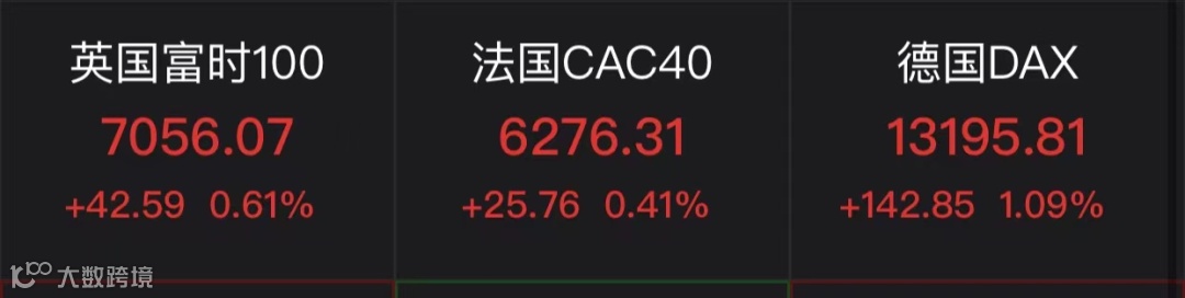 DAX指数涨1.09%,报13195.81点;法国CAC40指数涨0.41%,报6276.31点;英国富时100指数涨0.61%,报7056.07点。