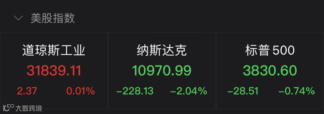 道指涨0.01%,报31839.11点;标普500指数跌0.74%,报3830.6点;纳指跌2.04%,报10970.99点。