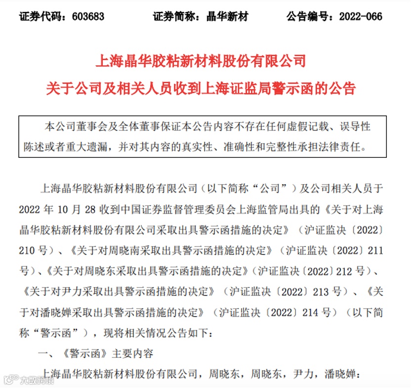 11月1日晚,晶华新材公告,公司及其董事长兼总经理周晓南、公司控股股东及实控人周晓东、公司财务总监尹力、公司董秘潘晓婵等于10月28日共收到
