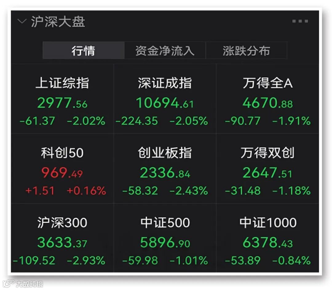 10月24日,A股三大股指冲高回落。截至收盘,沪指跌2.02%,深成指跌2.05%,创业板指跌2.43%。两市今日合计成交8810亿元。