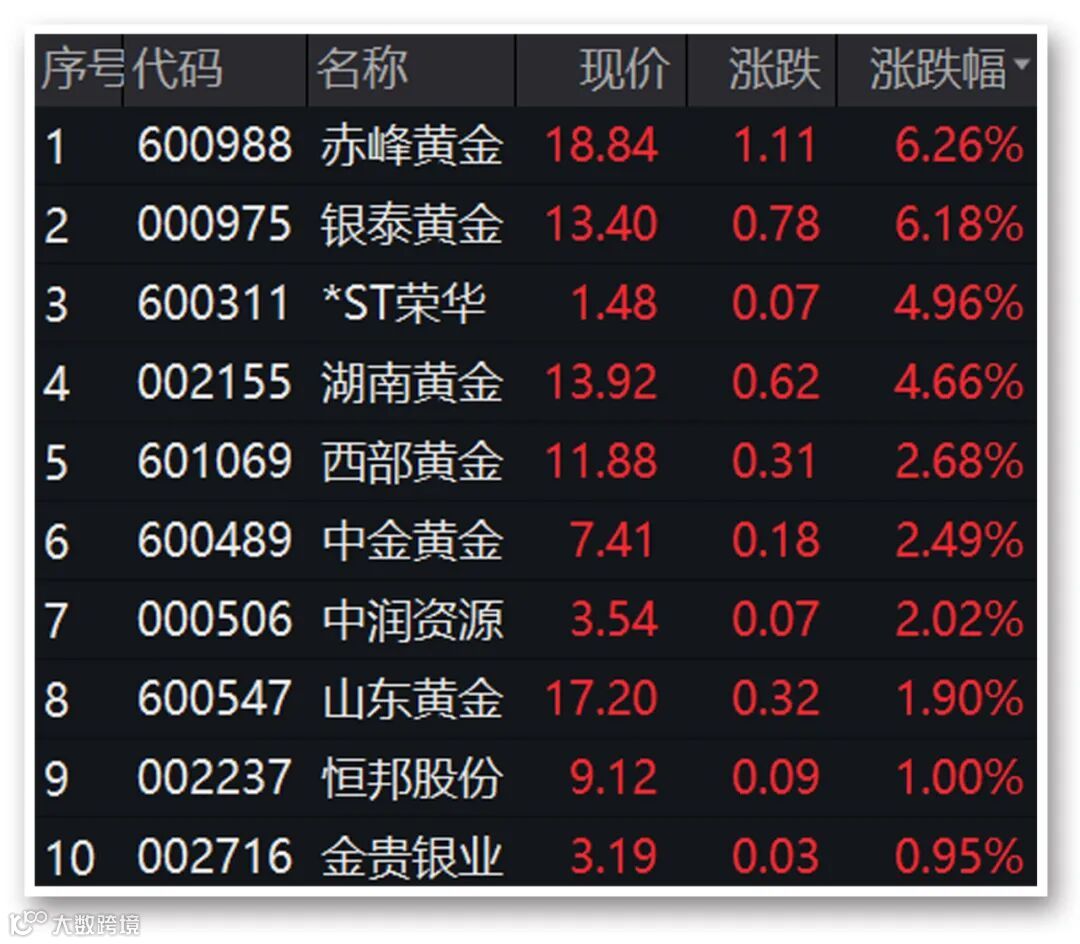 今日黄金股表现强势,位居两市涨幅榜前列。截至收盘,赤峰黄金、银泰黄金涨逾6%。