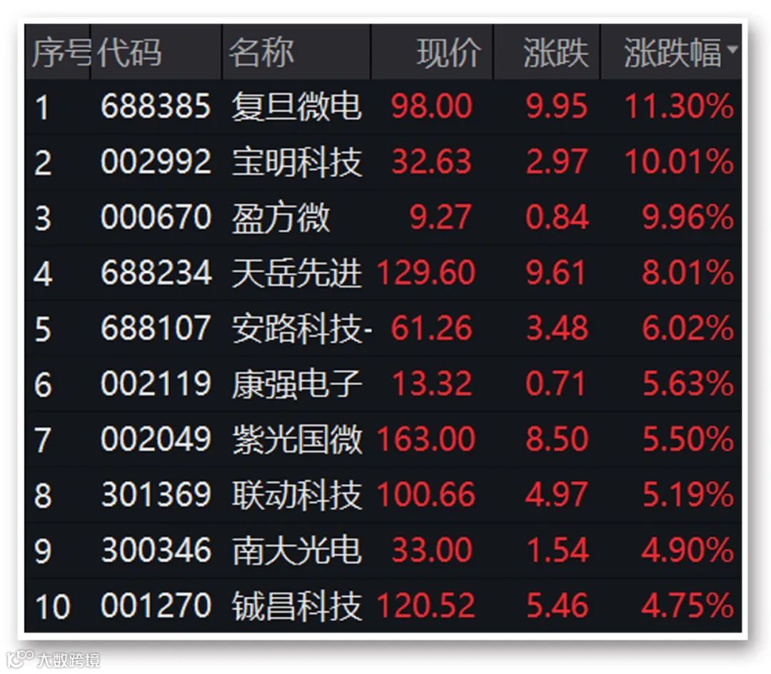 半导体板块今日开盘即迅速走高,表现活跃。截至收盘,复旦微电涨逾11%,宝明科技、盈方微涨停,天岳先进、康强电子、紫光国微等涨逾5%。