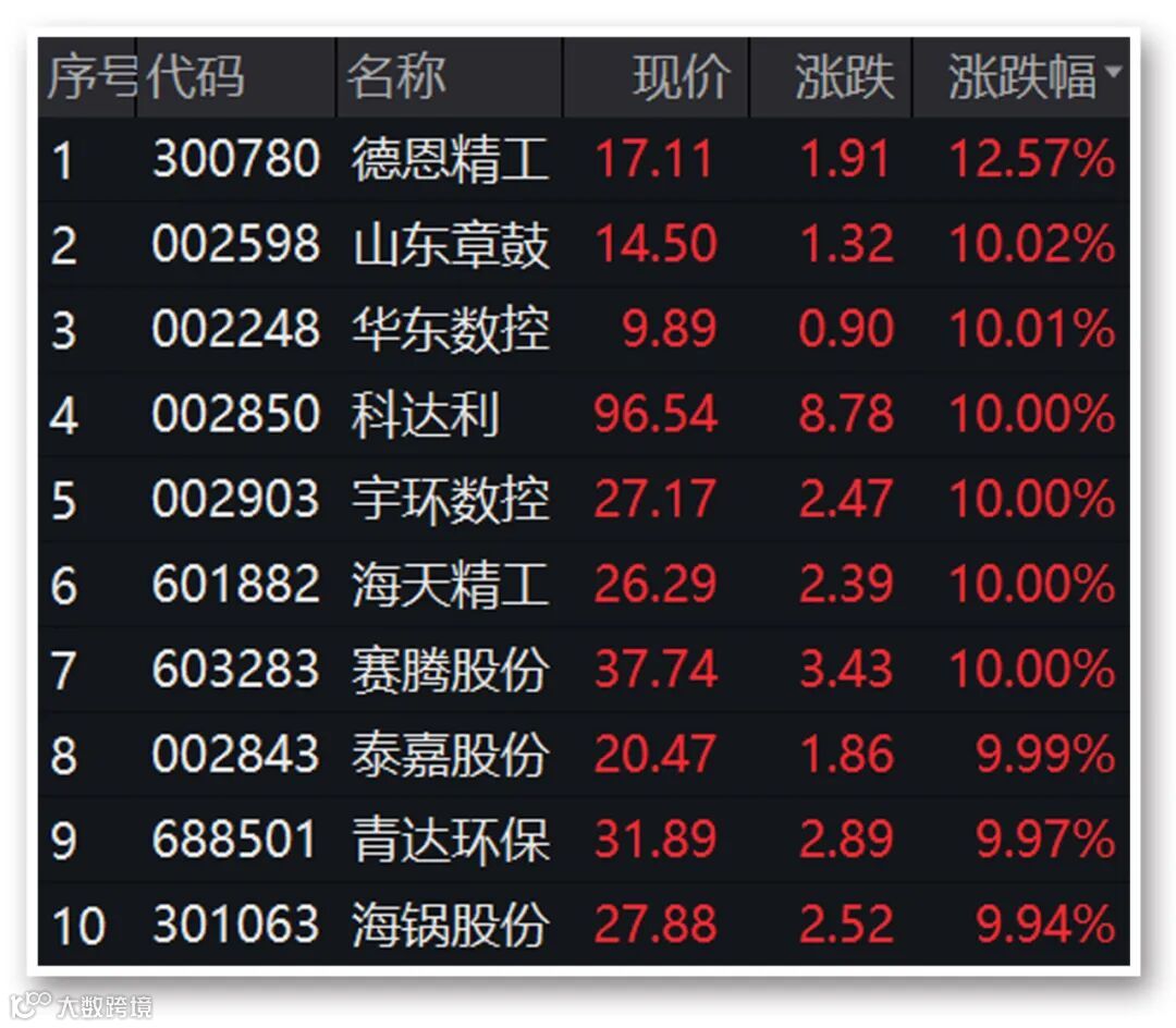 工业母机概念今日再度活跃,多股涨停。截至收盘,德恩精工涨逾12%,华东数控、科达利、宇环数控、海天精工、赛腾股份、宝塔实业等多股涨停,华中数控涨近8%。近10个交易日,海天精工累计涨逾52%,华东数控上涨近50%。