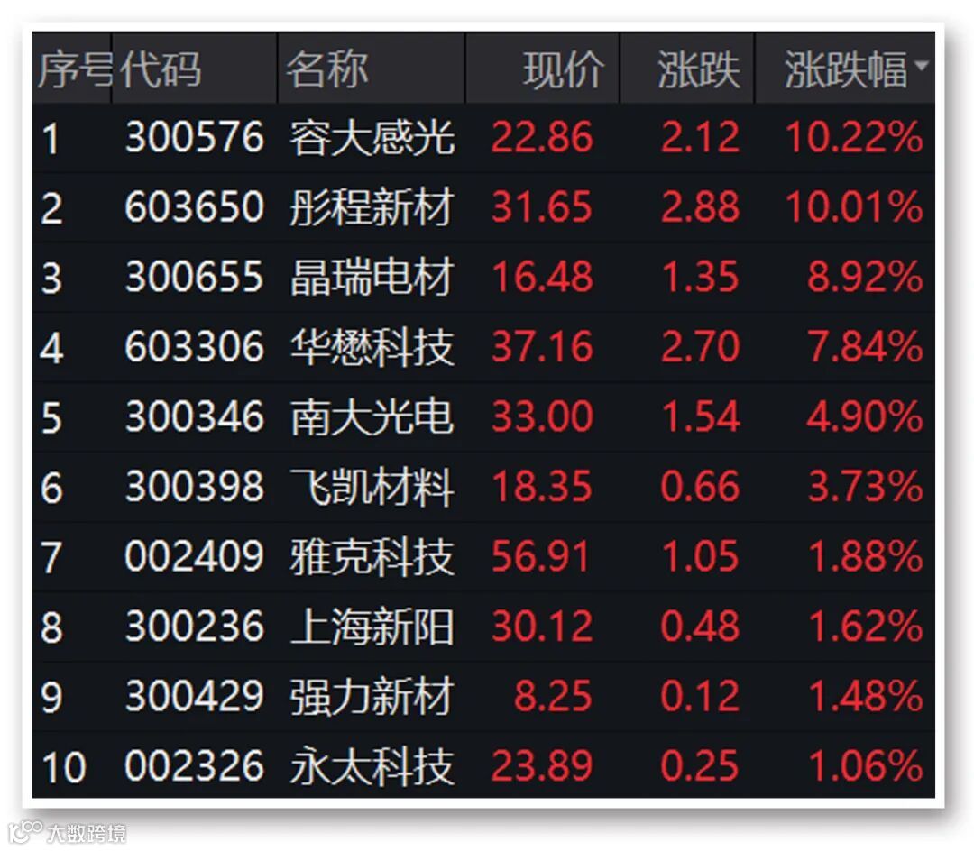 受需求快速提升利好刺激,光刻胶概念股今日爆发,位居两市涨幅榜首位。截至收盘,容大感光涨超10%,彤程新材涨停,晶瑞电材、华懋科技涨8%左右,南大光电涨近5%。