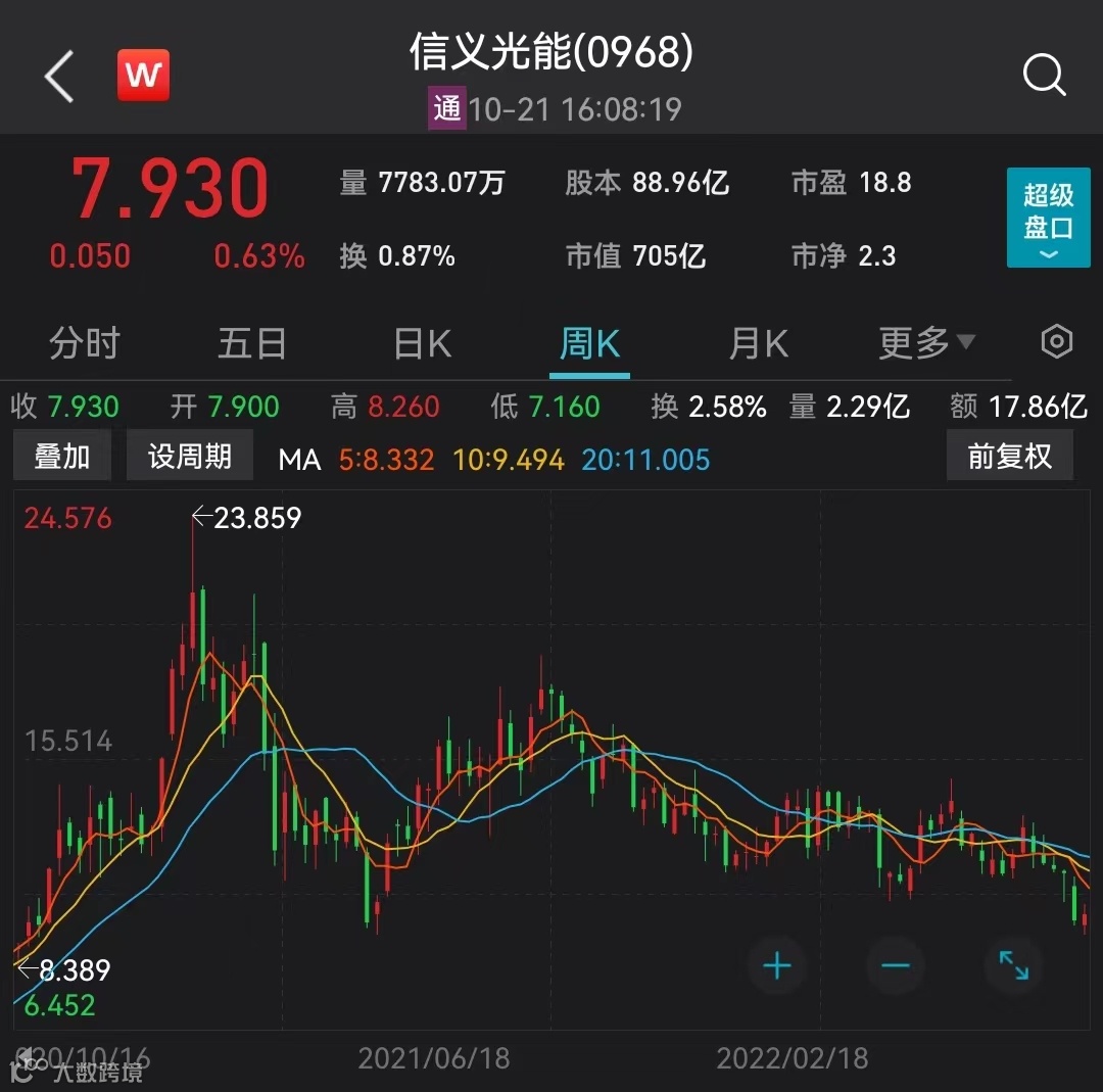 10月21日,信义光能港股早盘一度跳水,随后震荡走高,收盘上涨0.63%,收报7.93港元/股,全天共成交6.15亿港元,最新市值705.4亿港元。