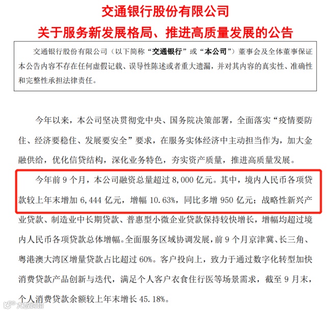 交通银行表示,今年前9个月,该行融资总量超过8000亿元。其中,境内人民币各项贷款较上年末增加6444亿元,增幅10.63%。战略性新兴产业贷款、制造业中长期贷款、普惠型小微企业贷款保持较快增长,增幅均超过境内人民币各项贷款总体增幅。