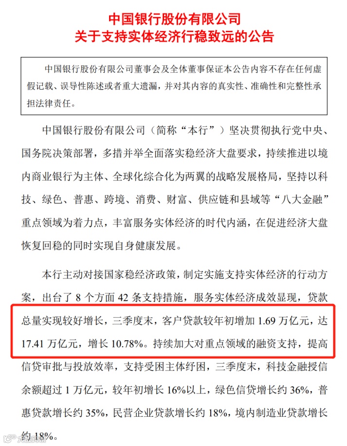 中国银行表示,三季度末,该行的客户贷款余额达17.41万亿元,较年初增长10.78%。三季度末,科技金融授信余额超过1万亿元,较年初增长超16%,绿色信贷增长约36%,普惠贷款增长约35%,民营企业贷款增长约18%,境内制造业贷款增长约18%。