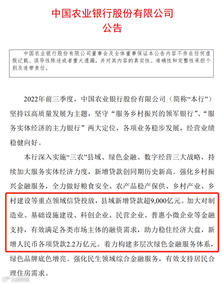 农业银行表示,今年前三季度,该行新增贷款创同期历史新高。三季度末,该行新增人民币各项贷款2.2万亿元。乡村振兴金融