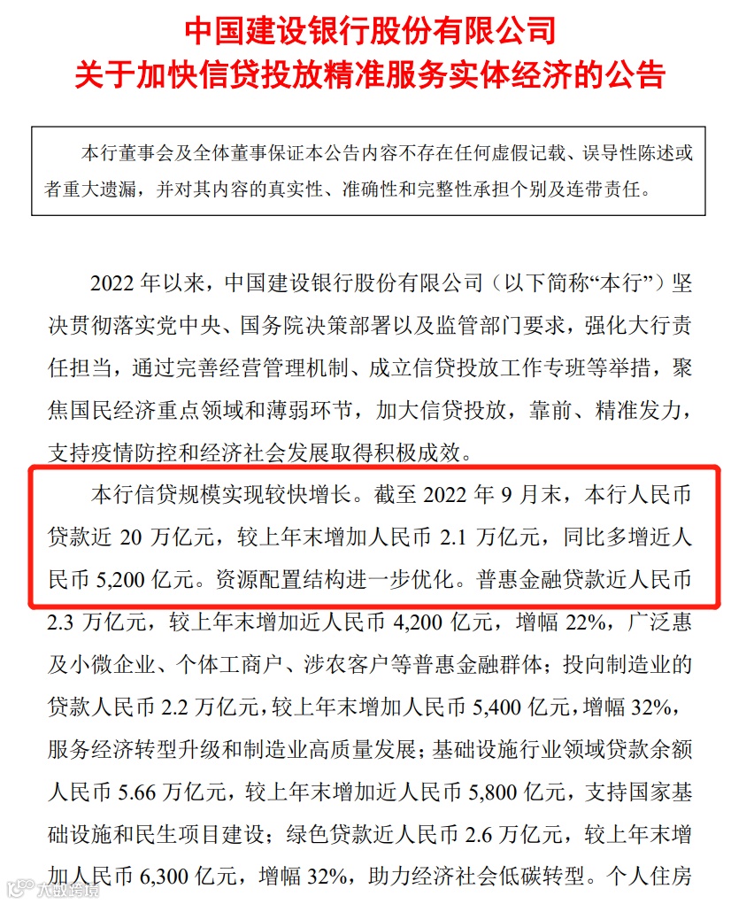 建设银行表示,截至2022年9月末,该行人民币贷款余额近20万亿元。其中,普惠金融贷款余额近2.3万亿元,较上年末增长22%;投向制造业的贷款2.2万亿元,较上年末增长32%;基础设施行业领域贷款余额5.66万亿元,较上年末增加近5800亿元。