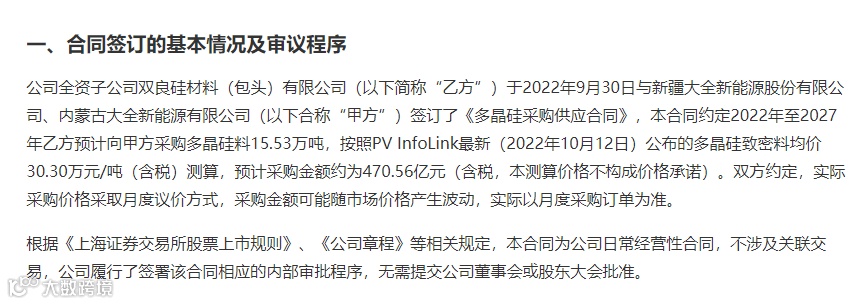 公告显示,双良节能全资子公司双良硅材料(包头)有限公司9月30日与新疆大全新能源股份有限公司、内蒙古大全新能源有限公司签订《多晶硅采购供应合同》。合同约定,2022年至2027年,双良硅材料(包头)有限公司预计向对方采购多晶硅料15.53万吨。