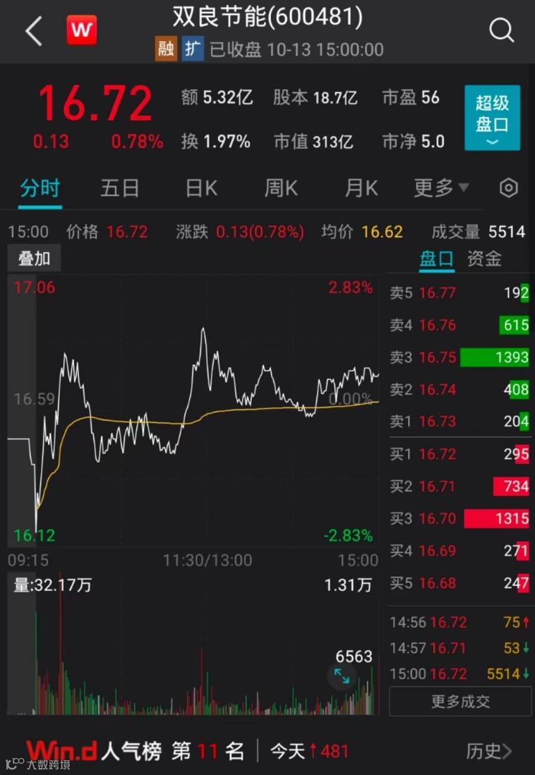 10月13日,双良节能股价报16.72元/股,市值313亿元。