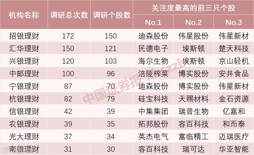 具体来看,招银理财、汇华理财、兴银理财、中邮理财最“勤奋”,三季度调研次数均超过100次。