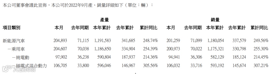 1-9月,比亚迪新能源汽车累计产销量119.16万辆和118.01万辆,同比增长248.74%和249.56%。