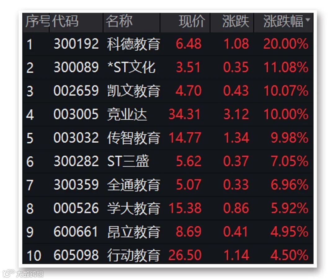 教育板块今日多股涨停,其中科德教育“20CM”涨停,凯文教育、传智教育等涨停,全通教育、学大教育、昂立教育、行动教育跟涨。