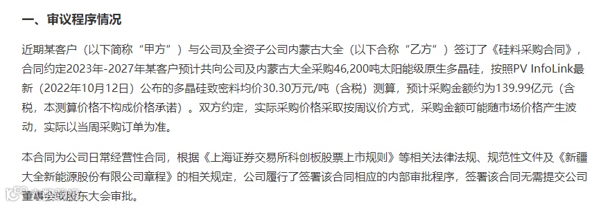 大全能源10月17日晚公告,近日与某客户签订《硅料采购合同》,预计向公司采购46200吨太阳能级原生多晶硅,预计采购金额约139.99亿元(含税)。
