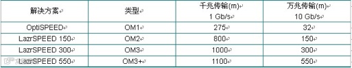 美国康普公司的多模光缆分为多模OptiSPEED®解决方案(62.5/125μm)和万兆多模LazrSPEED® 解决方案(激光优化万兆50/125μm)。LazrSPEED分成三个系列,即LazrSPEED 150、300、550系列,且LazrSPEED万兆多模光缆均通过UL DMD认证。具体传输指标请看下表: