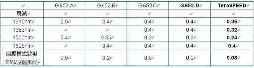 同时,由于G.652.D 是单模光纤的最新的指标,是所有G.652级别中指标最严格的并且完全向下兼容的。如果,仅指明G.652意味着 G.652.A 的性能规范,这一点应特别注意。TeraSPEED 光纤超过所有的指标均满足 G.652.A, .B, .C和.D 的性能规范,如下表: