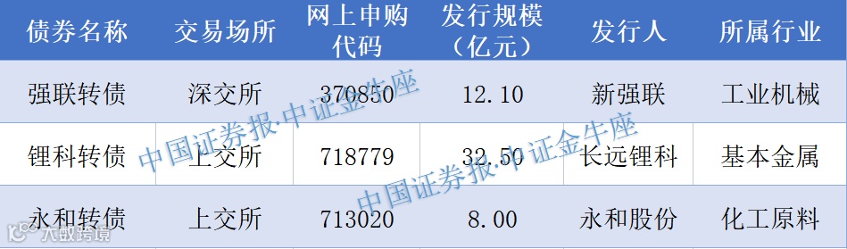 10月11日(周二)将有3只可转债发行,其中锂科转债发行规模超30亿元,强联转债、永和转债发行规模则分别为12.10亿元、8亿元。