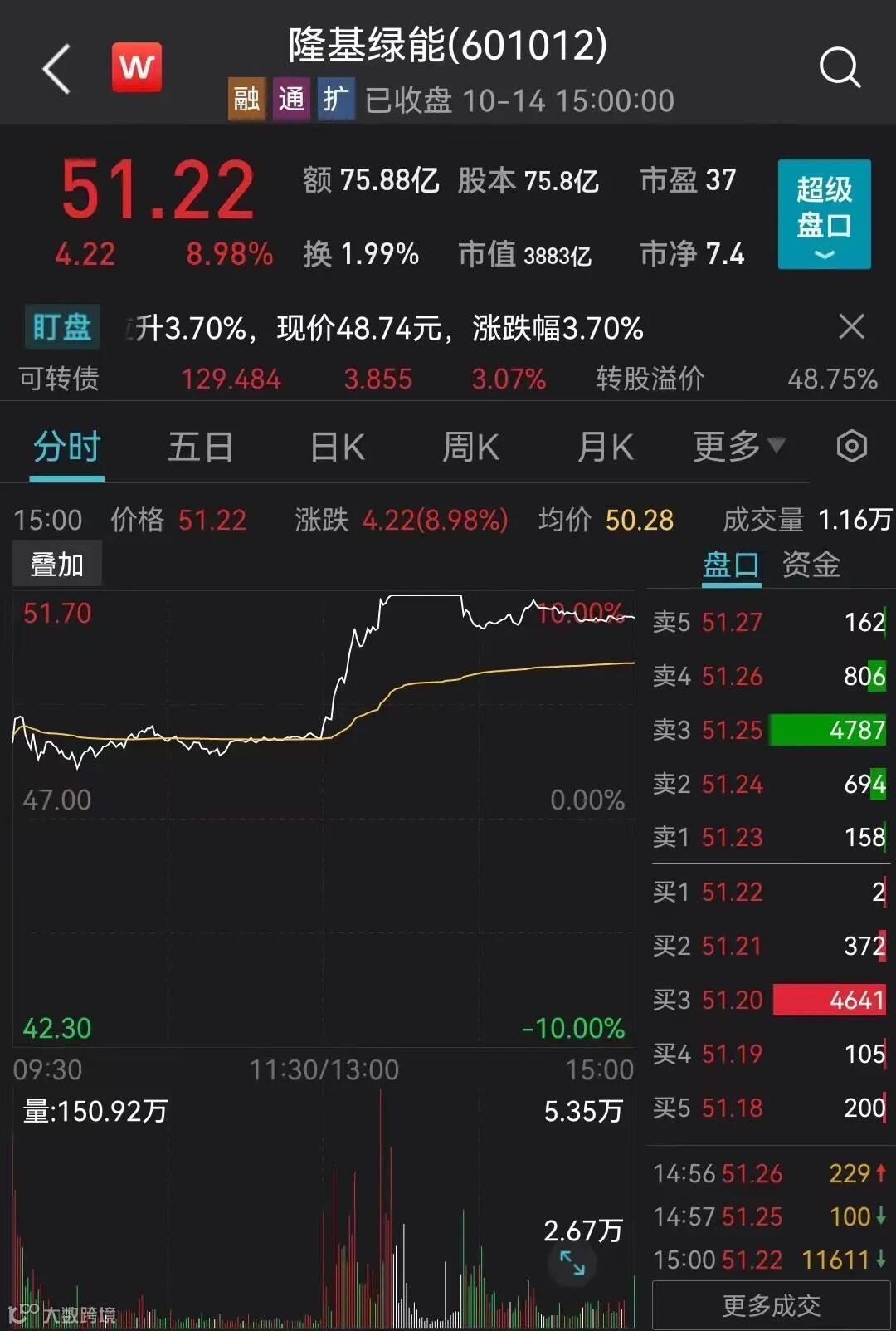 10月14日,隆基绿能表现亮眼,盘中曾触及涨停。截至收盘,隆基绿能上涨8.98%,股价突破50元/股大关,报51.22元/股。13日晚间,隆基绿能发布今年1月-9月主要经营数据公告,公司预计前三季度实现归母净利润为106亿元-112亿元之间,同比增长40%-48%。
