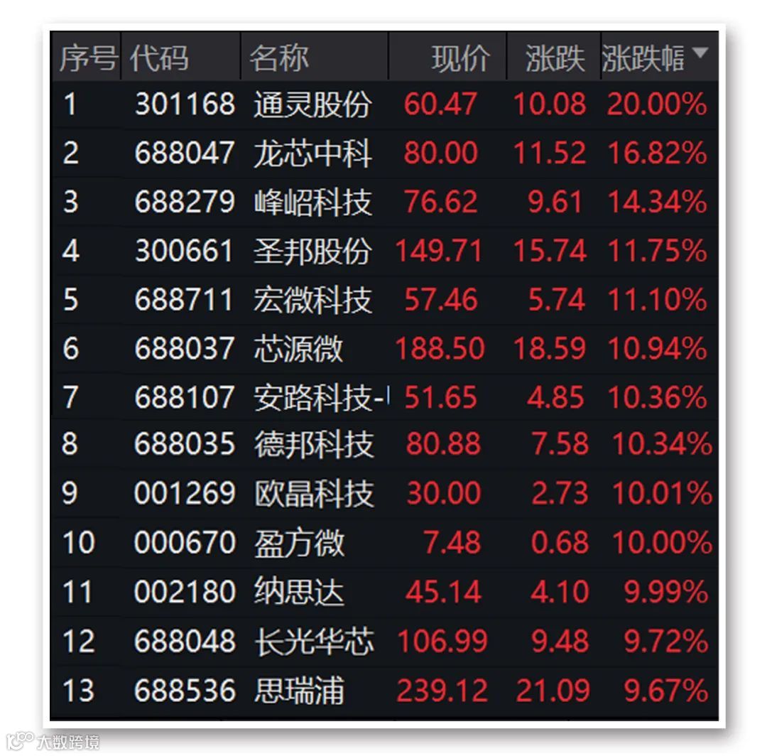 连续调整的半导体板块今日上演大反攻,Wind半导体板块涨幅超过10%或涨停的个股达10余只,近60只个股涨幅超过5%。截至收盘,通灵股份“20CM”涨停,龙芯中科、峰岹科技、圣邦股份、芯源微、宏微科技、安路科技-U、德邦科技涨幅超过10%,欧晶科技、盈方微、纳思达等涨停。