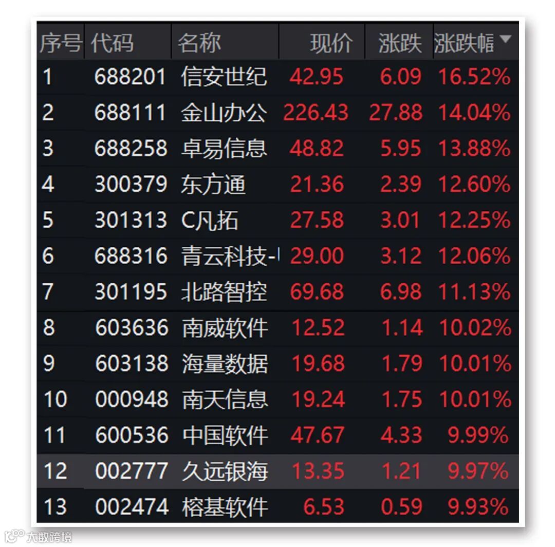 软件股今日也表现突出。截至收盘,信安世纪、金山办公、卓易信息、东方通、C凡拓、青云科技-U、北路智控涨幅均超10%,南威软件、海量数据、南天信息、中国软件、久远银海、榕基软件等涨停。