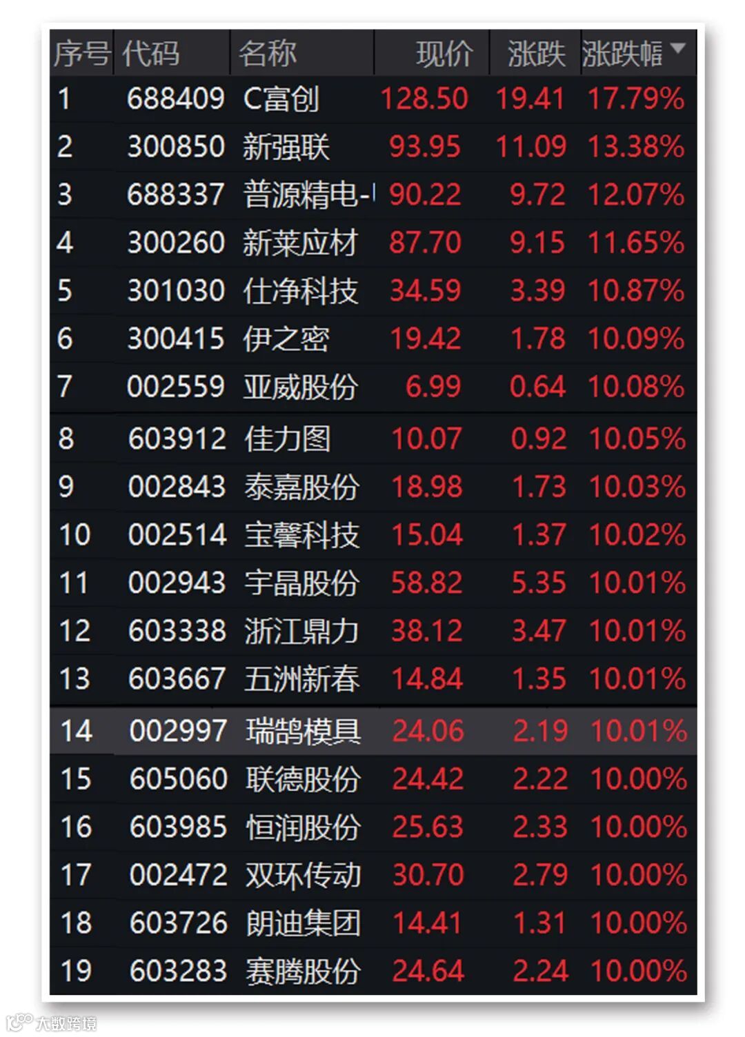 工业机械板块今日也表现突出,上演涨停潮。截至收盘,C富创、新强联、普源精电-U、新莱应材、仕净科技、伊之密涨逾10%,亚威股份、佳力图、泰嘉股份、宝馨科技等十多只个股涨停。