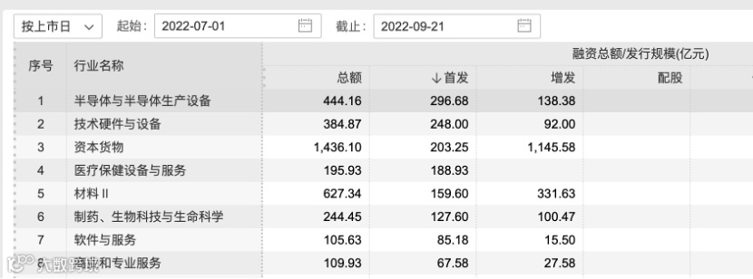 分行业来看,截至9月21日,第三季度首发募资额排第一的是半导体与半导体生产设备行业,融资总额为296.68亿元;其次是技术硬件与设备行业、资本货物行业,分别融资248亿元、203.25亿元。
