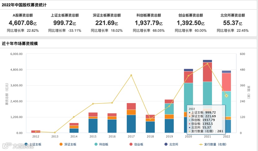 分上市板块来看,科创板以1937.79亿元位列首发融资额排行的首位,其次是创业板,首发融资总额达1392.50亿元。上证主板、深证主板、北交所的首发融资总额分别为999.72亿元、221.69亿元、55.37亿元。