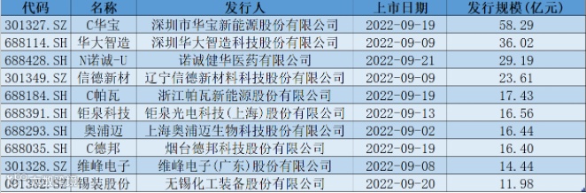 具体来看,截至9月21日,32家公司于9月上市,首发募集资金388.76亿元。按上市日口径统计,9月以来,4家公司的首发募资总额超过20亿元。其中,华宝新能以58.29亿元位居首发募资总额榜首。