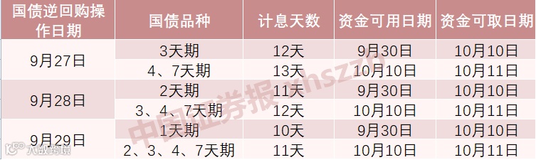 9月29日卖出1天期国债逆回购(注意是卖出而不是买入,代表将钱借出),资金可于10月10日取出,计息天数达10天(9月30日-10月9日)。