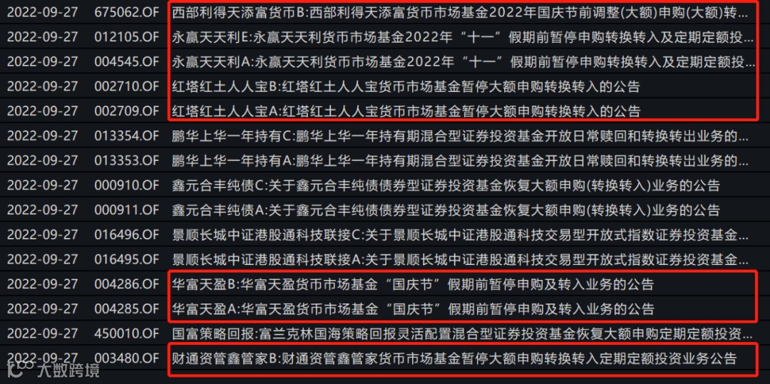9月27日,多只货币基金发布限购、暂停申购的公告。
