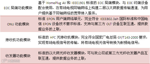 EOC局端产品为模块化设计,通过功能模块组合成多种产品形态。主要功能模块包括:EOC 局端功能模块、ONU功能模块、接收机功能模块和收发器功能模块。