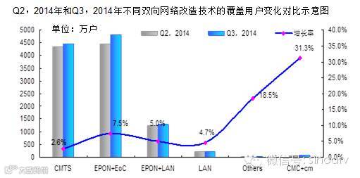 EPON+EoC技术方案的覆盖用户超过CMTS技术方案的覆盖用户,研究数据显示,2014年第三季度,EPON+EoC技术改造的双向网络覆盖用户增量超300万户,EPON+EoC技术覆盖用户保持快速增长,总覆盖用户超过4700万户,超过CMTS技术方案的覆盖用户(4441.1万户。研究预计2015年,EPON+EoC技术覆盖用户将持续保持较快增加,市场占比进一步增加。