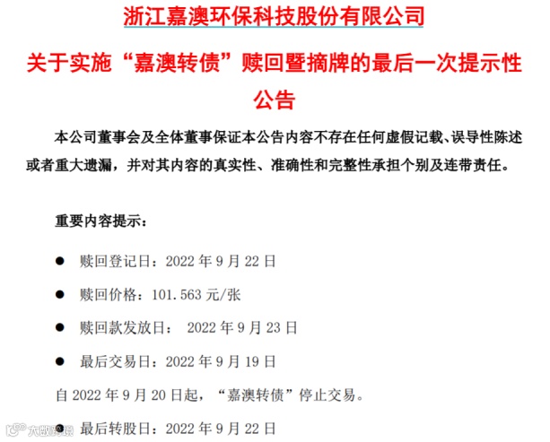 嘉澳环保9月21日公告显示,2022年9月22日为嘉澳转债最后转股日,投资者仅能选择以每张100元的票面价格加当期应计利息(合计每张101.563元)被强制赎回。本次提前赎回完成后,嘉澳转债将在上交所摘牌。