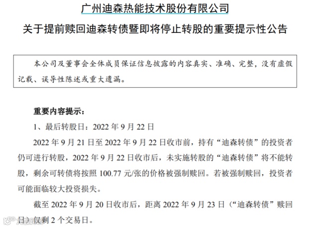 迪森股份9月20日发布公告称,2022年9月22日收市后,仍未实施转股的迪森转债将不能转股,剩余可转债将按照每张100.77元的价格被强制赎回。本次赎回完成后,迪森转债将在深交所摘牌。
