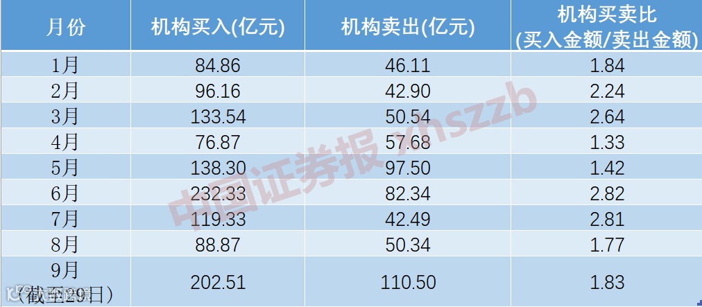 中国证券报记者梳理分析数据发现,9月A股大宗交易热情高涨,机构资金“功不可没”。机构正通过大宗交易大举买入A股,9月机构席位通过大宗交易买入202.51亿元,暂居全年月度机构买入金额第二位。